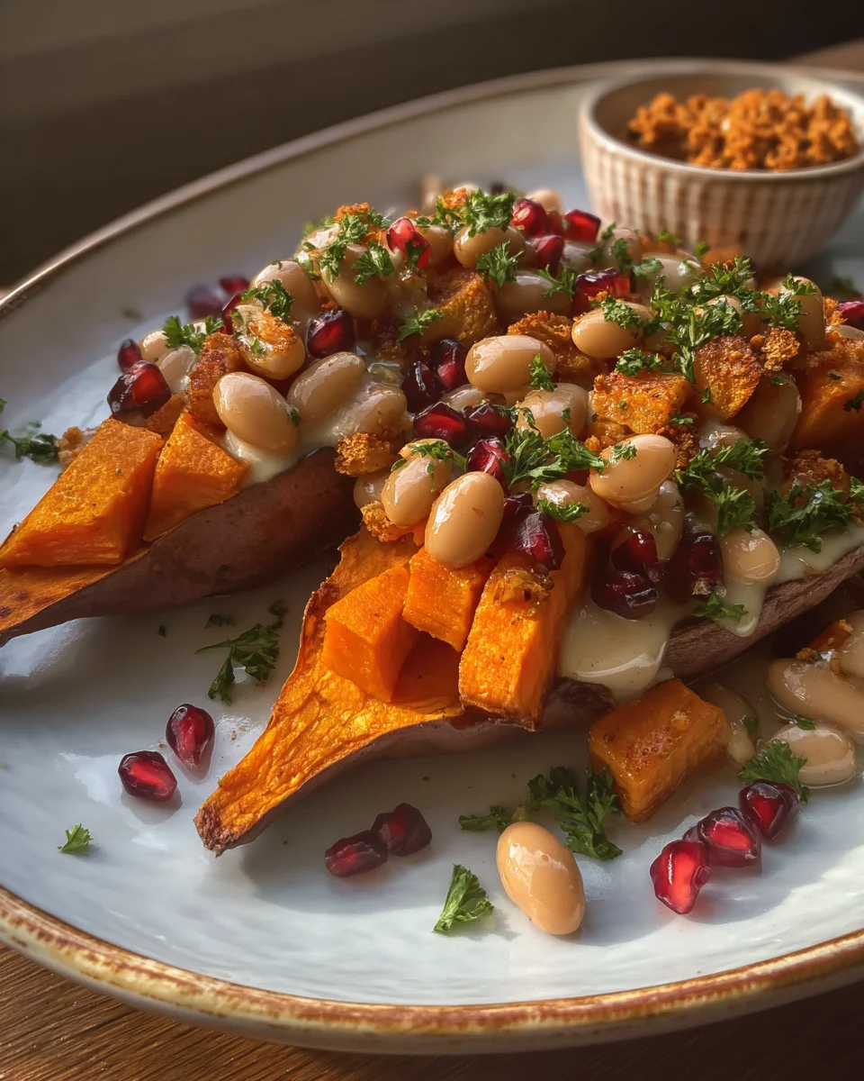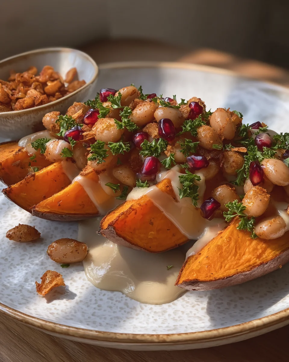 Experience the delightful fusion of sweet and savory with Sweet Potato with Butter Beans Crunch, a wholesome dish perfect for any occasion. This recipe features tender roasted sweet potatoes topped with a crunchy, herb-infused mixture of butter beans, garlic, and smoked paprika. Ideal as a nutritious side for family dinners or a light main course for cozy nights, this dish is not only easy to prepare but also bursting with flavor and vibrant colors that will entice your senses. Enjoy the heartiness of this vegan delight while reaping its nutritional benefits.