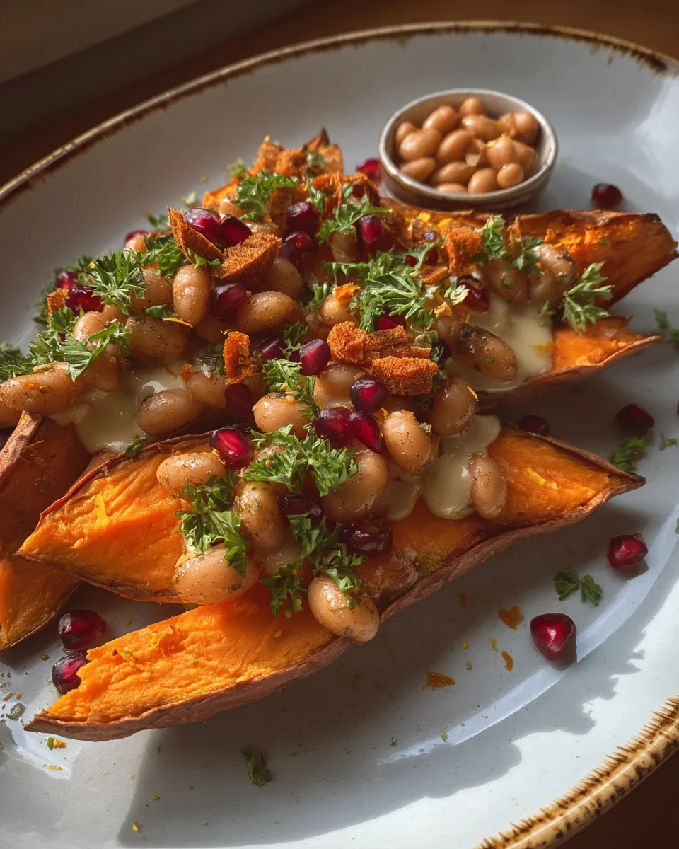 - Slice open roasted sweet potatoes, fluff the insides with a fork, and top with the crunchy bean mixture.